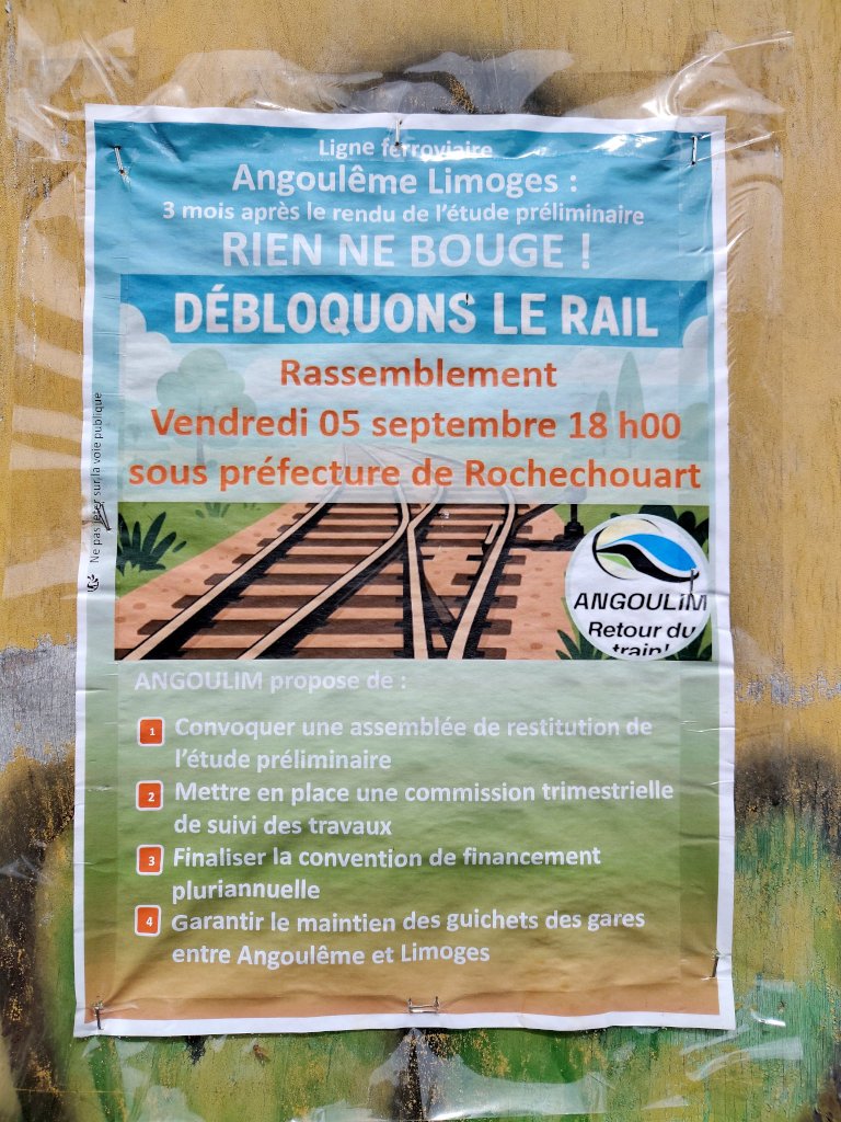 Mes pérégrinations estivales en région m’amènent à surtout circuler véhiculé, transporté tantôt en voitures conduites par des particuliers, tantôt par des cars de la région Nouvelle Aquitaine, avec une appréciation toujours très relative des conditions de transport (accueil limité de certains chauffeurs, fiches horaires contradictoires (mises à jour…), mise en soute de bagages, radios écoutées à bord) et de l’offre (atrophique et atypique) sur l’axe de Limoges à Angoulême via Saillat, dont la gare n’est même pas desservie par la ligne de car « régulière » en correspondance avec les trains…scandaleux ? Assurément déroutant, et un signe de plus du déclassement d’un énième « territoire ». Déclassement et isolement dont les annonces de recherche de médecins et de dentistes affichées à la traversée de certaines communes plus loin se font tristement le relais.